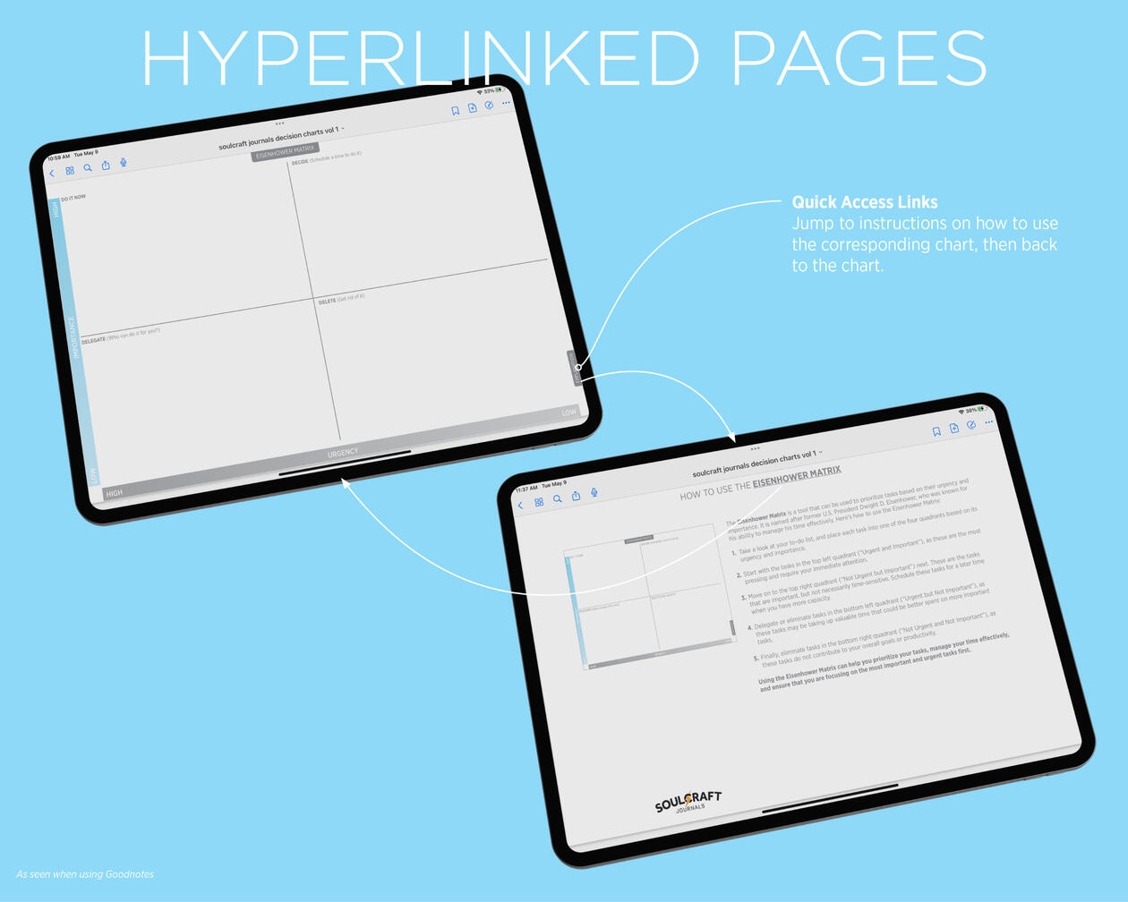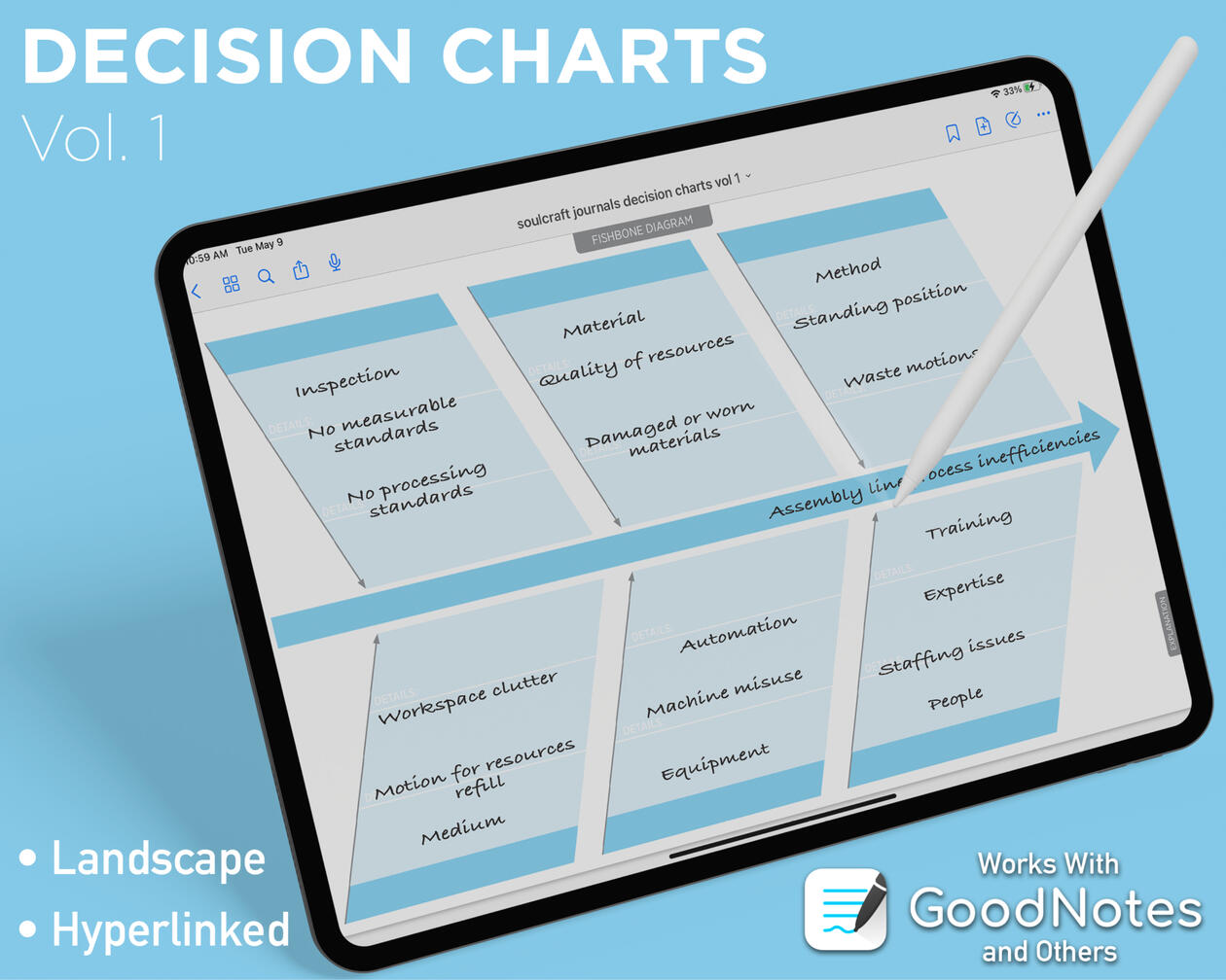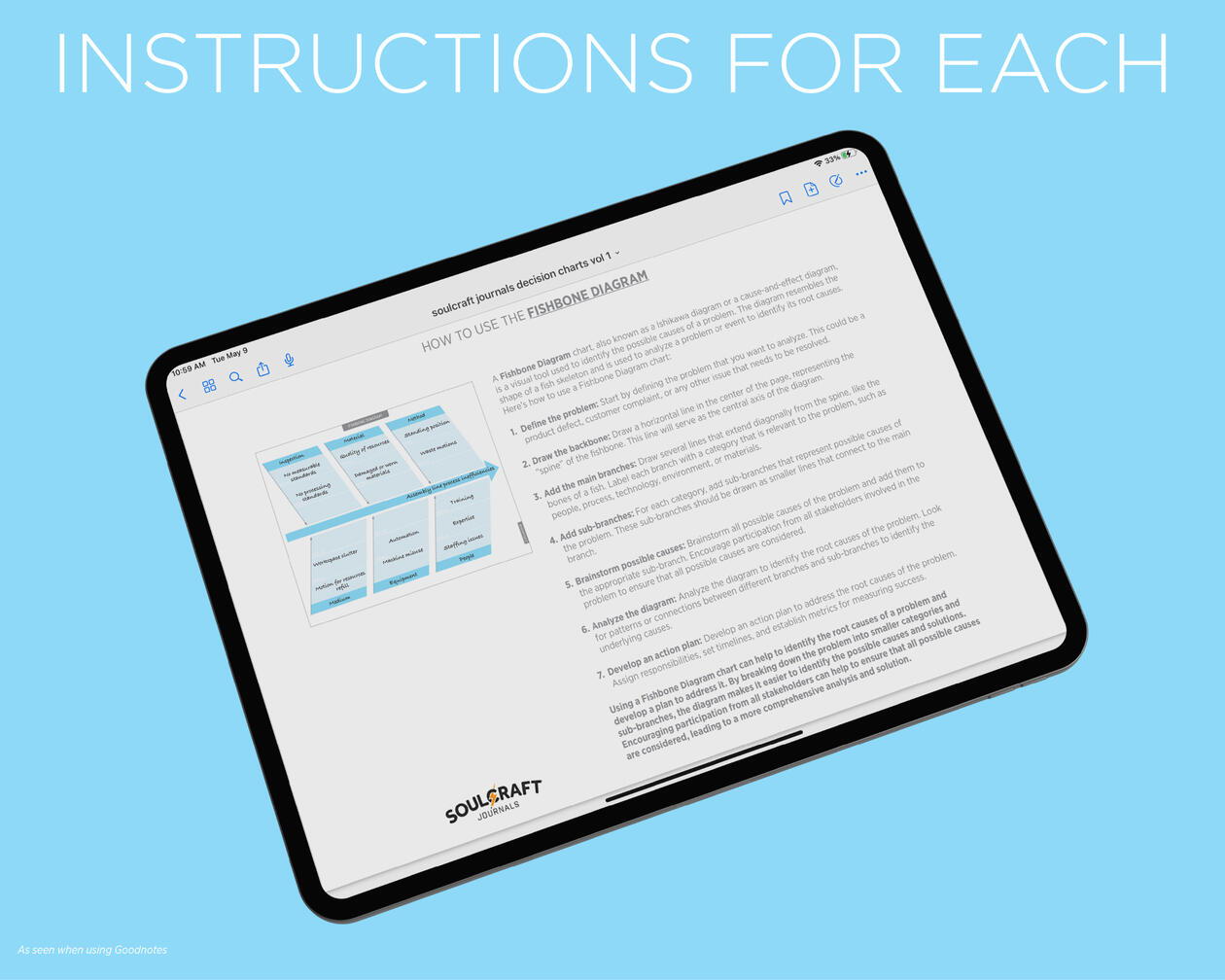 Making decisions about things more complex than vanilla or chocolate can get difficult, especially when it comes to business. Soulcraft Journals’ Decision Charts can help you make those complex decisions in a structured and organized way. Using visual charts can help clarify the decision-making process by breaking it down into steps and identifying key factors. This can help reduce bias and emotion in decision-making and improve the overall quality of the decision. Additionally, decision charts can allow for easier comparison of options and help identify potential consequences and risks associated with each option. By using decision charts, individuals can feel more confident and informed about their decisions, which can lead to better outcomes and less regret.I can’t guarantee you will make the right decisions, but these will help you think clearly about it. Works great with The DOER daily journal.Soulcraft Journals’ Decision Charts include the following:• Ten (10) different charts/matrices; Eisenhower Matrix, Venn diagram, Stakeholder Analysis, SWOT, 5 Why’s, Force field analysis, Re-Framing Matrix, 6 Ways Of Thinking, Mind Map, Fishbone Diagram.• Hyperlinks to instructions for using each• Hyperlinks from instruction back to the chart• Copy charts and use them over and over• Optimized to work horizontally on iPads• All you need to stay organized without being overwhelmed.The Soulcraft Journals Decision Charts are designed to be used on any PDF annotation app, such as GoodNotes, Notability, etc., on your iPad or tablet device. However, I recommend using an iPad with an Apple pencil and the Goodnotes App.WHAT YOU WILL RECEIVE IN YOUR DOWNLOAD:- 1 high-resolution PDF file - Decision Charts with linked instructions- 1 PDF Instruction Manual (Please read carefully)