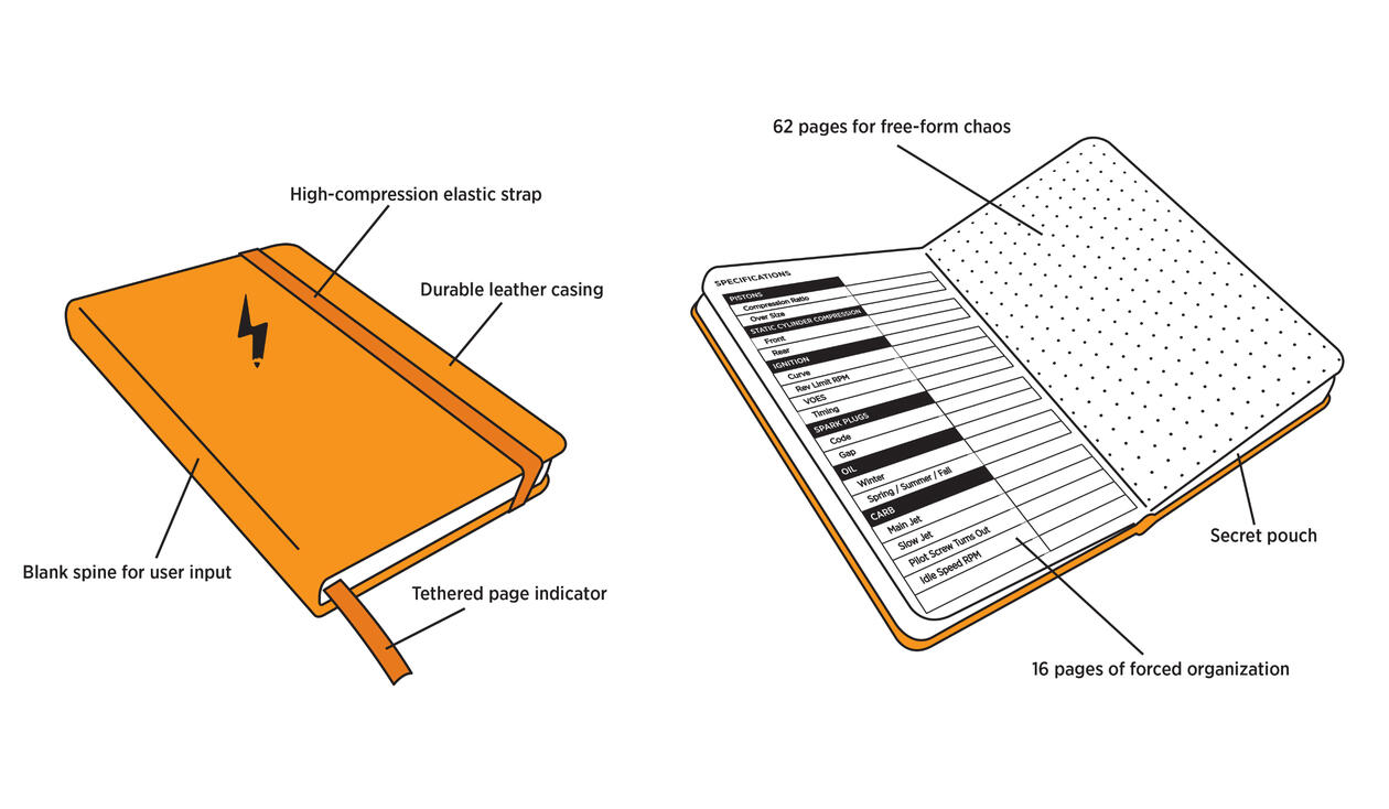 Keeping track of maintenance is one thing. Staying on top of everything involved with a custom motorcycle is another, especially if you have more than one.With The Moto Memo you’ll be able to keep track of all the things you think you’ll remember, and have one place to look when you need to recall something.KEY FEATURES:Fits easily in your pocket for trips around the block, to the hardware store, or around the countryLight color covers allow you to write the model and dates on the spine for easy organizingOrganized maintenance sections remind you of the things you need to do and fixBlank spaces let you create custom remindersQuick reference guides for sizes, weights, volume and more.Plenty of dot-grid pages allow you work out ideas, solve problems and remember stuff while you’re workingTouring / Camping checklistWinter storage checklistSPECS:3.54 in. x 5.51 in.Leather Hardcover with page marker ribbon80 pages (18 work and resource / 62 dot-grid)